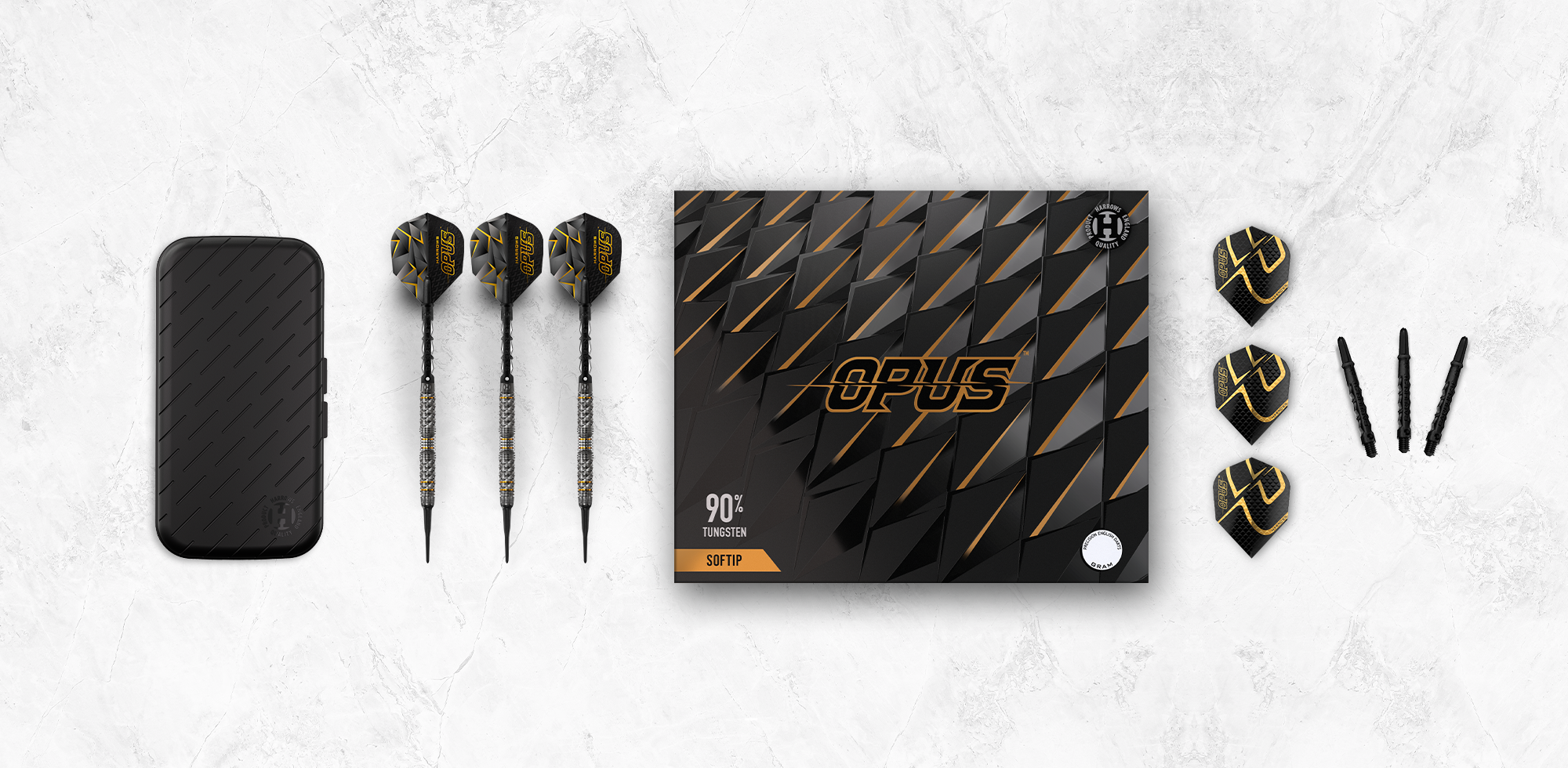 Opus darts are supplied with our new Slimcase, 2 sets of Carbon ST shafts, 2 sets of 100 micron Opus flights and are match weighed to +/- 0.05g.