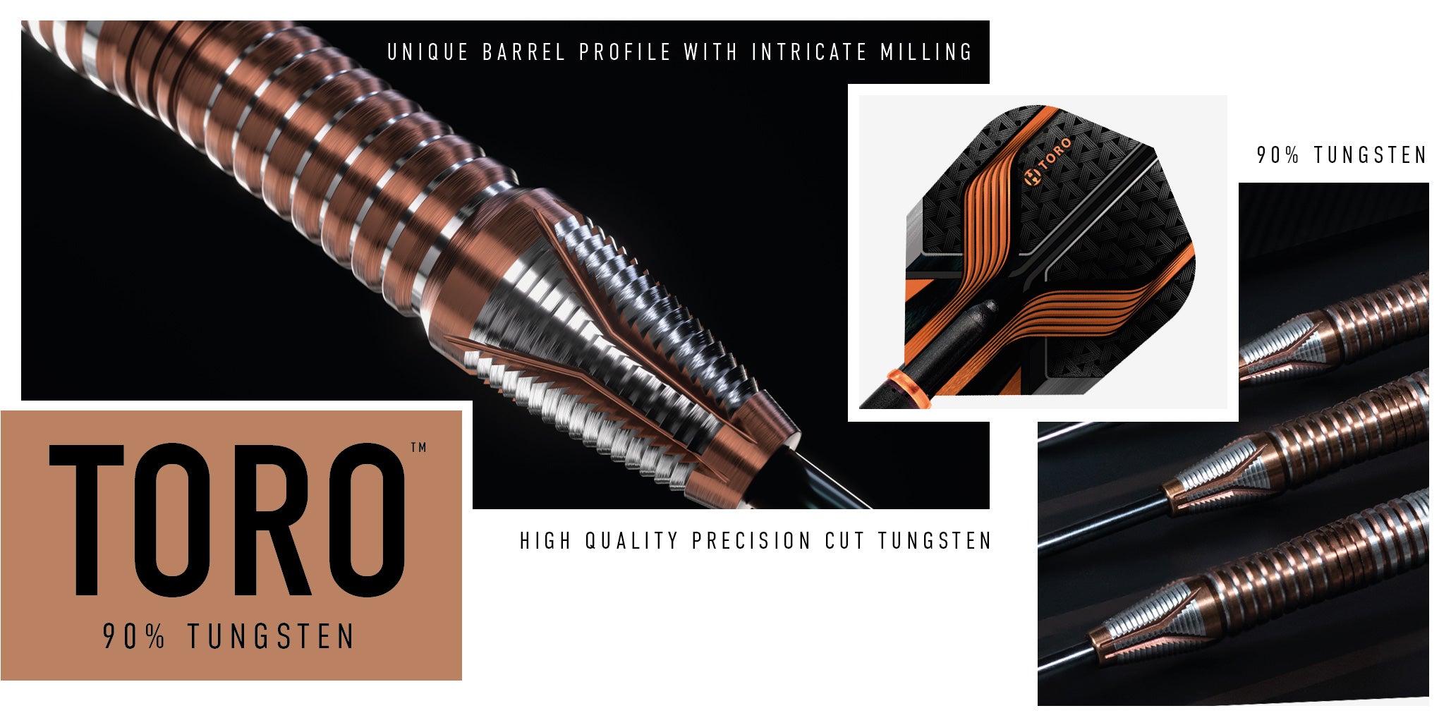 Toro 90% encapsulates all aspects of modern darts innovation; unique barrel shape, original grip sequences and striking colour combinations.